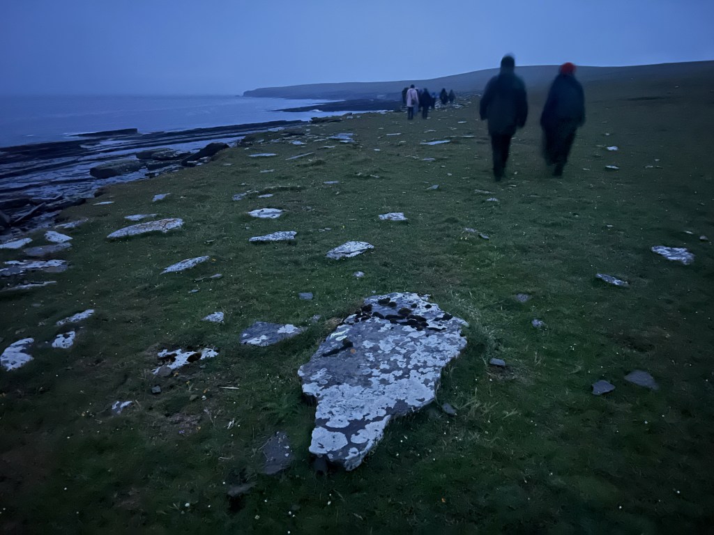 It was time to move again, this time northwards along the coast. Under the clouds, the light drained quickly to murk, which was fine to see by, but which held less and less colour. We passed a crater-pool of pale water, climbed a series of increasingly slippery stiles, and then, in from the south, the rain came to catch us — steadily and with no sign of stopping. Every so often we lost a member of our group as they cut across the fields for home. The land began slowly to rise, the wave-cut platforms to our left becoming great clefts of black rock lined with geos. As it got darker, white-lichened stones dotted throughout the grass were now what seemed to catch and return the light, glowing strangely beneath our feet. I thought about the last time I walked this stretch in 2021 — summer sun pushing through wisps of remaining haar, the piercing cries of the pickies (arctic terns) as they streamed overhead, and the calm and eerie waters of Ettan Pow’s natural pool.