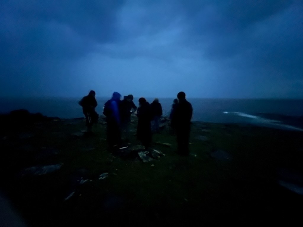 När vi gick var det lätt att gå mellan medlemmarna i gruppen, att prata sida vid sida i mörkret, om vad som hade fört oss alla till Papay, som boende eller besökare. Vi fick veta att vandringen varit en tradition i 16 år, startad av ett par 2007 och igång sedan dess. Vi vände inåt landet för att undvika klippkanterna, och tog ut en sträcka mot Mull Head, öns norra ände och en av Orkneyöarnas nordligaste utposter. Inom Orkneys skärgård är det bara spetsen av North Ronaldsay som sträcker sig längre mot polen. Nära midnatt hade de olika graderna av himmel (dunkel), hav (mörkt) och land (mörkast) vuxit sig allt närmare varandra, och jag märkte att det var lättare att se detaljer i utkanten av synfältet än i mitten. Höga stenrösen utspridda längs stranden blev omöjliga att skilja från stående figurer. Min telefonskärm var genomvåt och jag kunde inte använda den för att ta bilder, så jag lämnade den i fickan för att hålla ögonen anpassade till mörkret. Vi behövde inte någon ficklampa. Vid kanten av de låga klipporna gjorde vi en paus för att titta norrut mot horisonten, och undrade om vi skulle kunna se the Bore, en tidvattenvirvel i vattnet norr om Papay. Om man tog sig tid att leta kunde man hitta en mörkare fläck mitt i det mörka vattnet, en disig blåaktig oval — kunde vi se detta eller drömde vi bara?