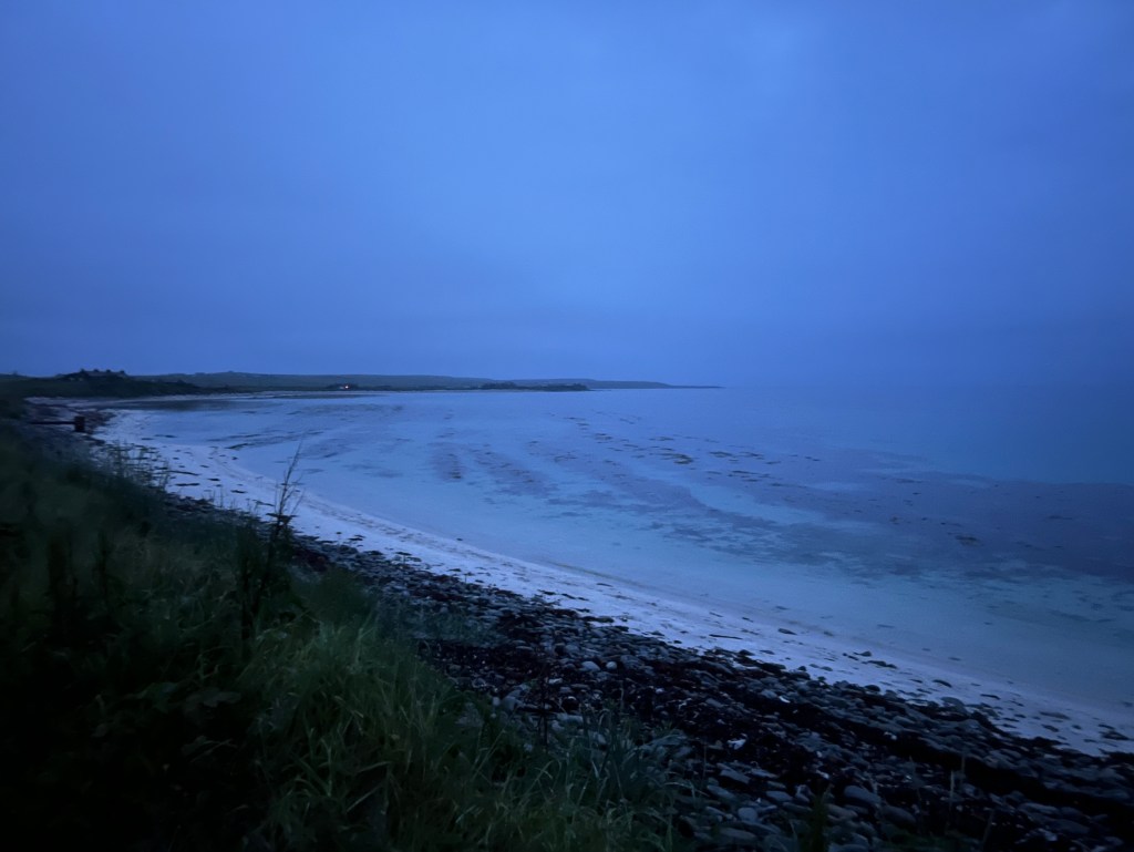 Rain was forecast overnight, so after the community had gathered to enjoy the film premiere, Mal and I hurriedly set up our tents at the hostel, occasionally enclosed by the smoke-drift from the nearby midsummer bonfire. In my imagination, Orkney in June is filled with calm, clear, bright nights, but this is not always the case — sometimes a layer of cloud or haar can settle in, blocking the sun, and this was one of those evenings. We joined our friends in their circle by the fire — no chairs left, so we sat in the long grass under the low grey clouds, chatting about Iceland, the Faroes and hot seaweed baths. After a while, we roused ourselves and our small group of walkers set off around twenty past ten in the evening. A neon gleam of orange to the north, matched by the glow of a streetlamp, was the only evidence of the setting sun.