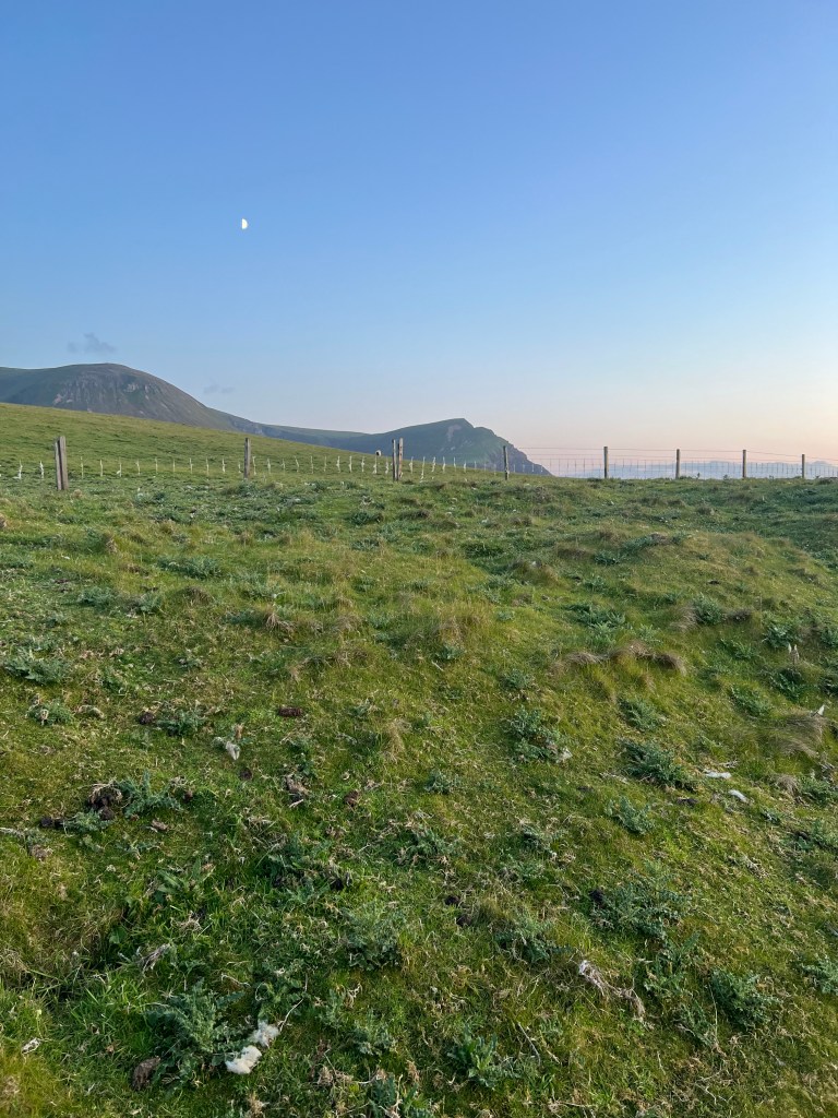We turned away from the shore just before 1am, and without the gleam of the sea, the land grew slightly darker, where pale bog cotton strands danced among the heather. Further inland, along the road, we startled a curlew into anxious flight, its warning cry echoing strangely against the steep sides of Ward Hill ahead. A wave of tiredness pushed us onwards, back to the shore where our tents and sleeping bags lay waiting to welcome us. It was hard to say when it was darkest, but as we reached the sea once more after 2am the waves and sky began to glow with a renewed strength. As put by Mal, later, ‘there was no beginning or end to the day, just a hazy barrier that we walked through without noticing the edges.’