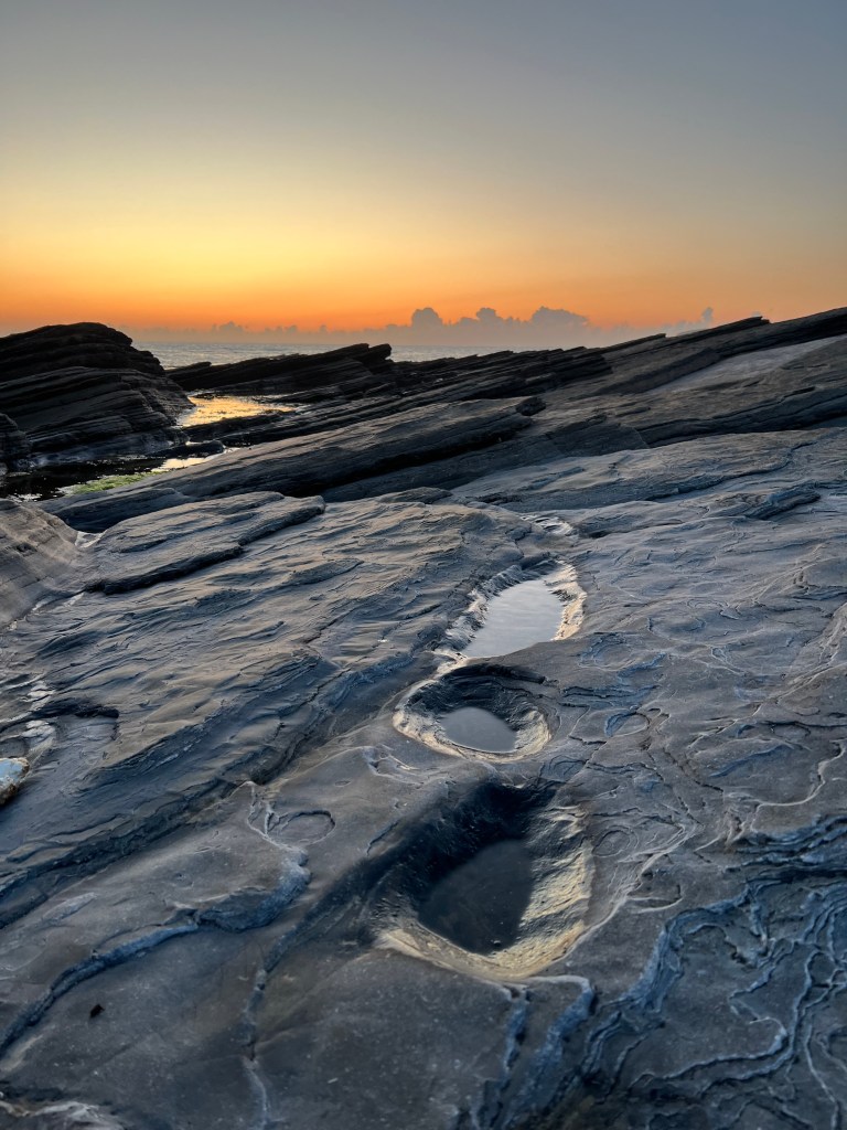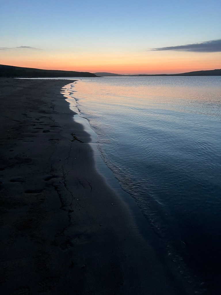Ljuset bar oss genom natten. Vi kunde lätt ta oss fram över stenstränderna, ta oss upp och ner för gräsbevuxna raviner, och utforska rostiga skeppsvrak och stenhällar med pölar fyllda med flytande silver. Vi tog tid på oss på stränderna, drack varm choklad och kaffe, och letade efter snäckor så sent som tjugo över elva (jag hade bara ögon för de små bulliga snäckorna “groatie buckies”, medan Mals favoriter mer var underdogs – rester av sjöborrar och trasiga valthornssnäckor). Horisonten i norr glödde fortfarande av orange, ovanför och nedanför kantat av blå himmel och silverglänsande hav, lysande mot den mörka stranden. På samma sätt som havsrosorna, lavarna och limpetarna nästan hade blivit till egna ljuskällor i Papays midsommarskymning, verkade havet här glöda underifrån: det samlade, bröt och reflekterade varje litet tillgängligt ljus. Jag blev påmind om hur författaren Audrey Magee skriver om just det här genom ett samtal mellan en ung irländsk öbo och en engelsk målare i sin bok The Colony: