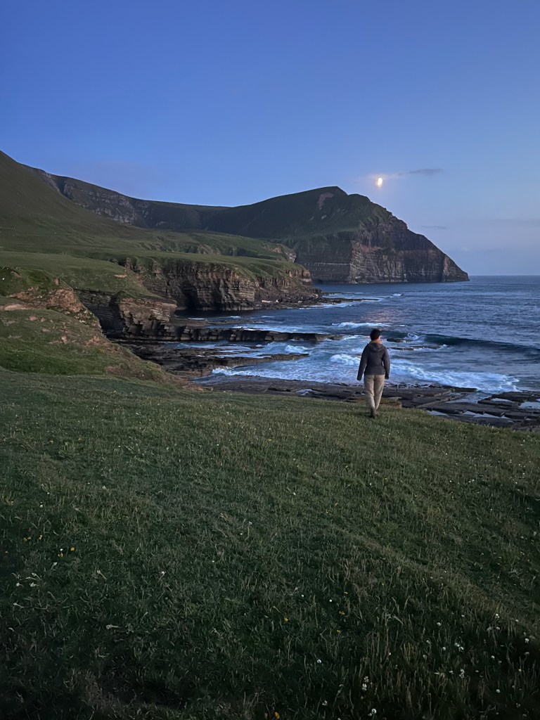 On 26th June, three days after our rainy Johnsmas walk in Papay, my friend Mal Grieve and I made a second attempt to follow the midsummer sun into the night, this time in Hoy, one of Orkney’s larger, darker, hillier islands, to the south-west of the archipelago. When travelling on the foot passenger ferry from Stromness to North Hoy, between your outward and return journey, you must encircle the nearby island of Graemsay. Mal and I enjoyed looping anticlockwise around this little island, which we had walked the coastline of together two years ago in June 2021. Watching from the ferry we relived our Graemsay walk in reverse — seeing our past selves wading through thick heather and marshy grass at the Lash, examining the scatterings of sand where Mal had gathered tiny pieces of maerl, and landing briefly at the pier where we had dangled our legs in the evening sun while waiting for the boat to take us home. I mentioned how happy I am to see Graemsay now, whether looking down from the Orphir Hills or Hoy’s east coast — an entire day shared between us, our memories held neatly in its smooth green oval. Mal responded with the satisfaction they find in having walked a perfect coastline in one neat loop — which I can relate to, as it’s the exact feeling which has pushed me along crumbling scree cliffs and through barbed-wire infested hummocks of grass while walking Orkney’s coasts over the last seven years. Now, even in the depths of winter, Graemsay will always glow with the memories of that June day. I’m glad it’s a feeling which I can share with friends.