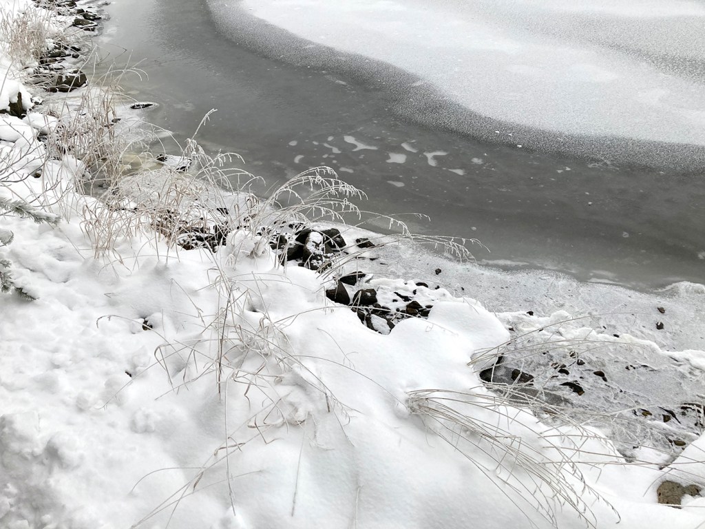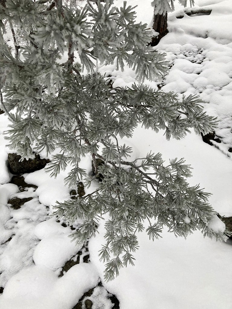 Vi åker ut till Värmdö och går längs med havet i mitten av december. Allt är stilla och tyst. Allt luktar snö. Tiden har stannat, inte ens vasstråna vid iskanten rör sig. De är täckta av rimfrost, precis som tallarnas barr och stammar. Inga ljud hörs, inte från fåglar, inte från ekorrar, inte från bilar. Den tjocka mattan av snö suger upp allt och får platsen att verka som en helt egen värld. Trots att det är en molnig dag är ljuset välgörande, skuggorna jämnas ut när det studsar mellan marken, träden, isen och himlen. Det är som att vara inuti ljuset, ett matt och allomfattande ljus. Skorna sjunker ner i snön när jag går in från bryggan för att fotografera tallarna på nära håll, det knarrande ljudet sugs upp direkt. Detta är vinter.
