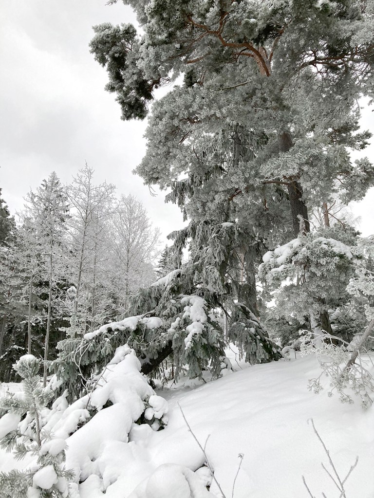We drive out to Värmdö and walk along the sea in mid-December. Everything is still and quiet. It smells like snow. Time has stopped, not even the reeds at the edge of the sea ice move. They are covered in hoarfrost, just like the pine needles and trunks. No sounds are heard, not from birds, not from squirrels, not from cars. The thick carpet of snow absorbs everything and makes the place seem like a world of its own. Even though it’s a cloudy day, the light is benevolent, the shadows smoothed out as it bounces between the ground, the trees, the ice and the sky. It is like being inside the light, a dull and all-encompassing light. The shoes sink into the snow as I step in from the dock to photograph the pines up close, the crunching sound absorbed immediately. This is winter.