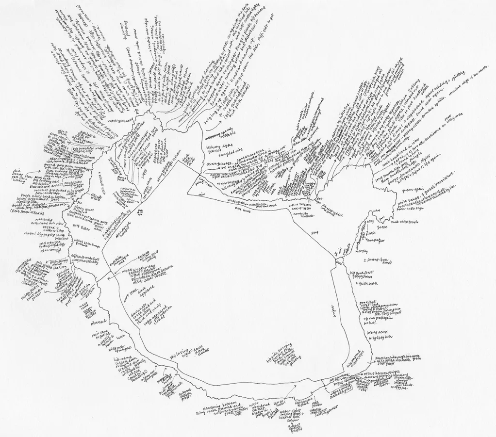 Mina vandringar registreras med hjälp av en kombination av GPS-spårning, fotografier och handskrivna anteckningar på kartor. Jag håller mig så nära kustlinjen som det är möjligt och säkert, och varje del går jag bara en gång. Detaljer från turerna loggas noggrant: kuststräckan, tidsåtgången och mina upplevelser och upptäckter skrivs ner längs med rutten. Till en början litade jag mer på mitt minne och skrev mindre. Nu, när jag går på öar där jag aldrig har bott, är jag girig; Jag skriver ner allt, mina ord rinner ut i havet.